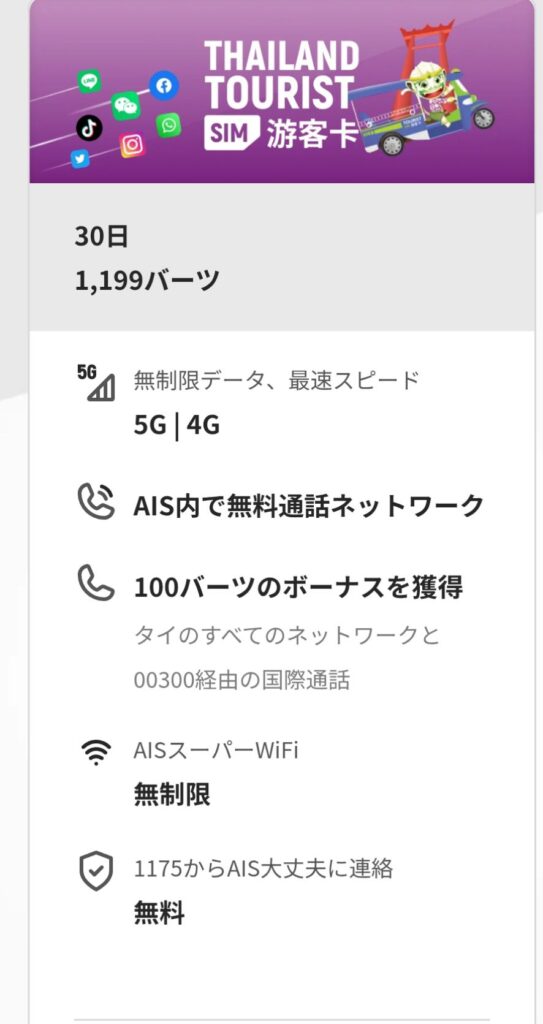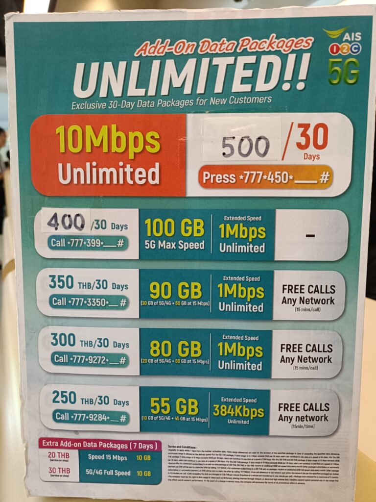 2026年1月現在、空港だと無制限で1199バーツ(約5995円)でしたが、街中ショップだと500バーツ(約2500円)