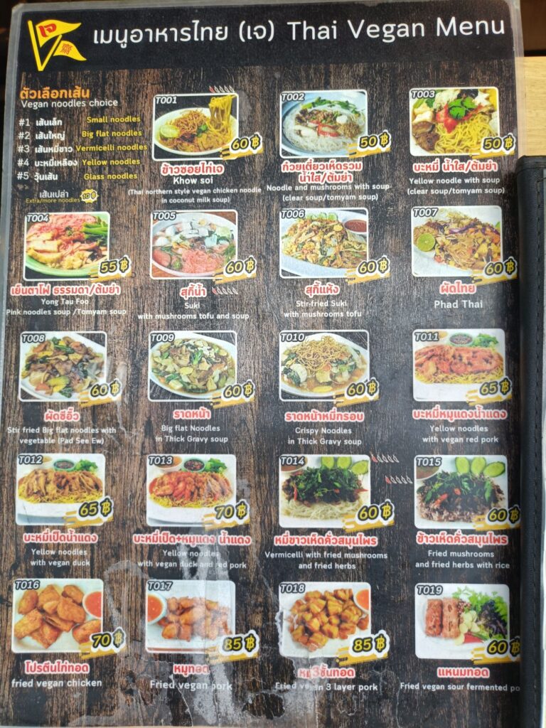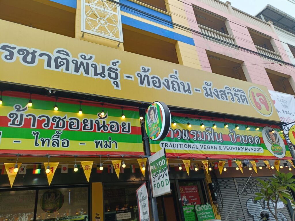 黄色の三角に旗はタイ語でジェーと言って、ベジタリアンを意味します。タイでは、ベジタリアン週間があり、この旗がスーパーなどにも並びます。そんな文化もあり、タイは日本よりベジタリアンのお店が多い印象です。