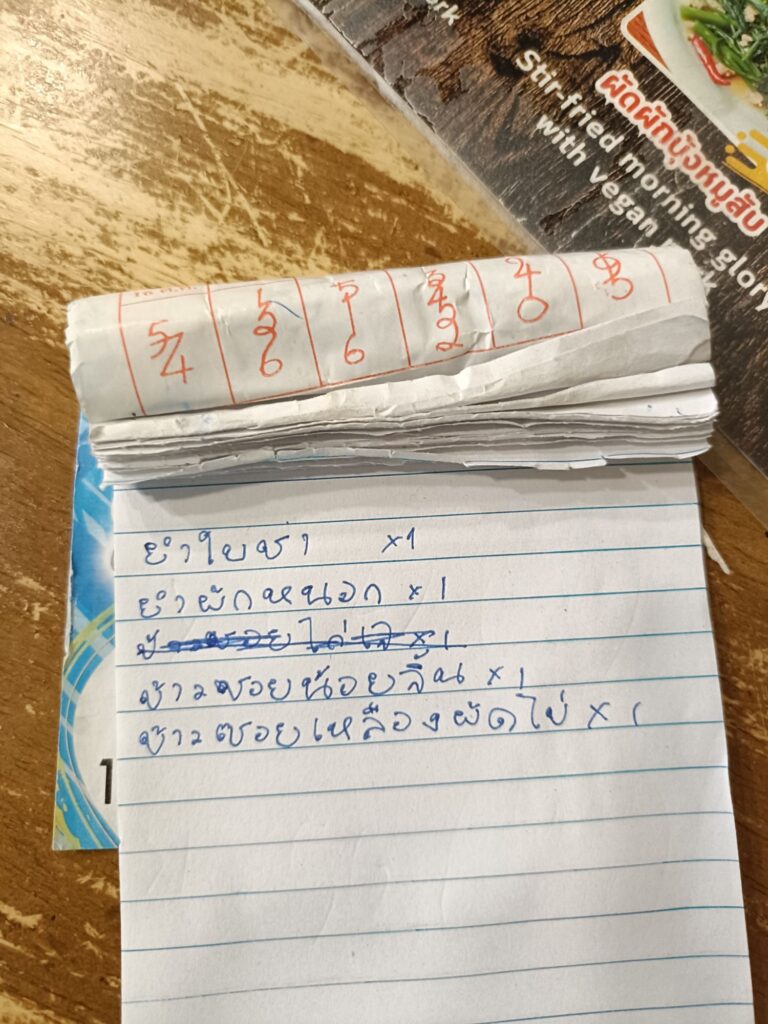 タイのローカル店はこの手のスタイルなのですが、この藁半紙みたいなのメモとタイの青ボールペンがレトロかわいくて好きです。(同士いますか?)
