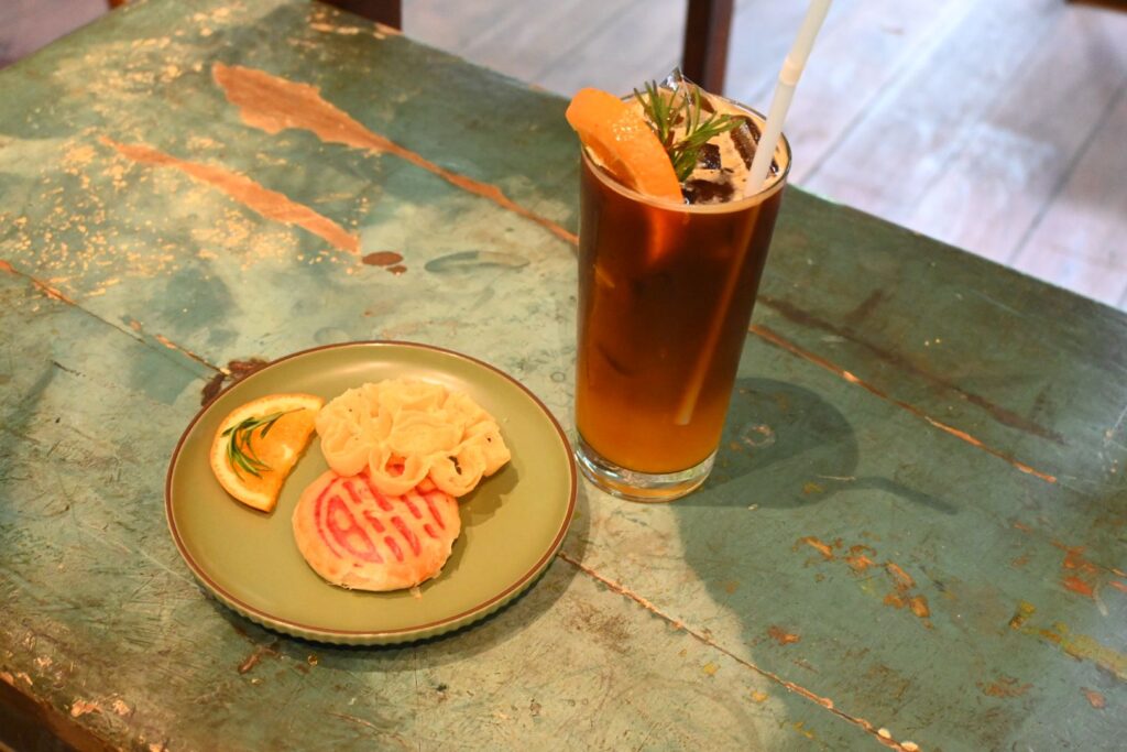 ブラックオレンジ110バーツ (アメリカーノとオレンジジュース)と中華菓子